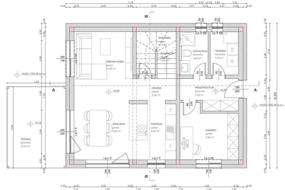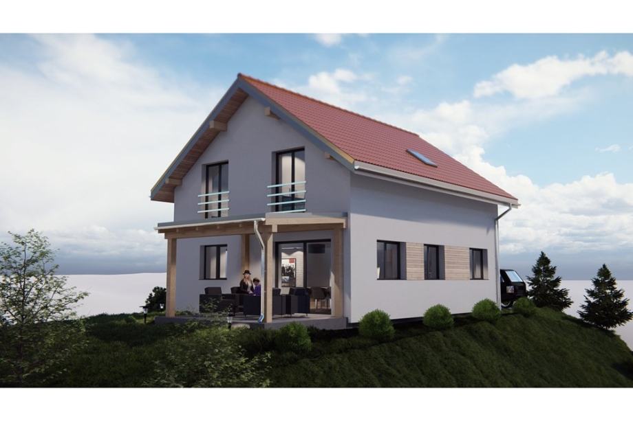 Hiša je podolgovate tlorisne oblike in ima skupno bruto dimenzijo 10,0 m x 8,0 m + dodatno pokrito teraso velikosti 3,30 m x 4,30 m. Objekt je zasnovan sodobno in energetsko učinkovito.