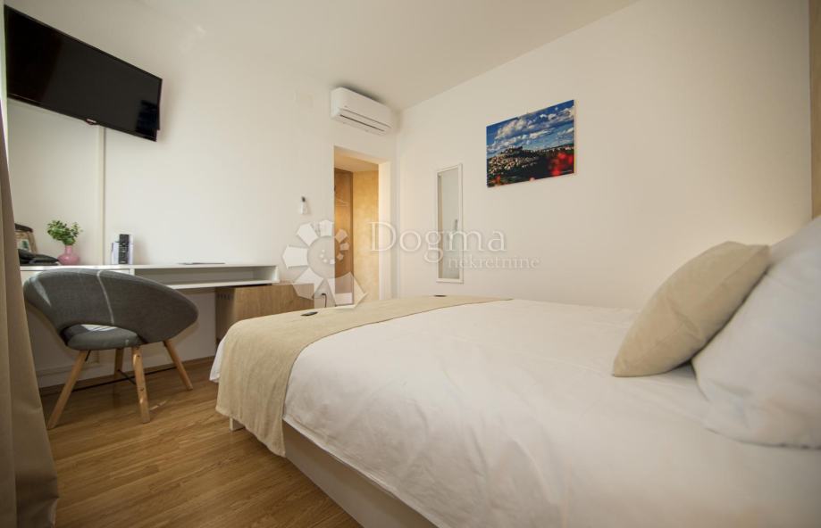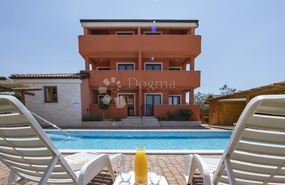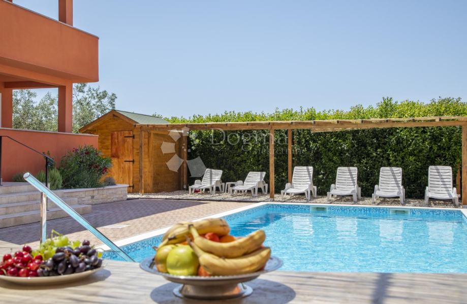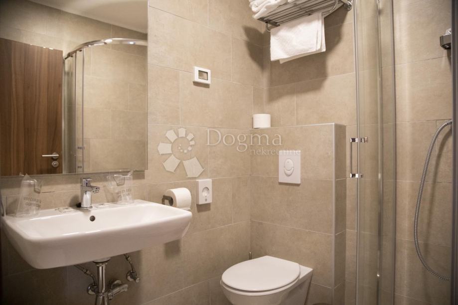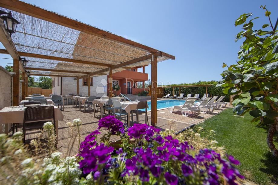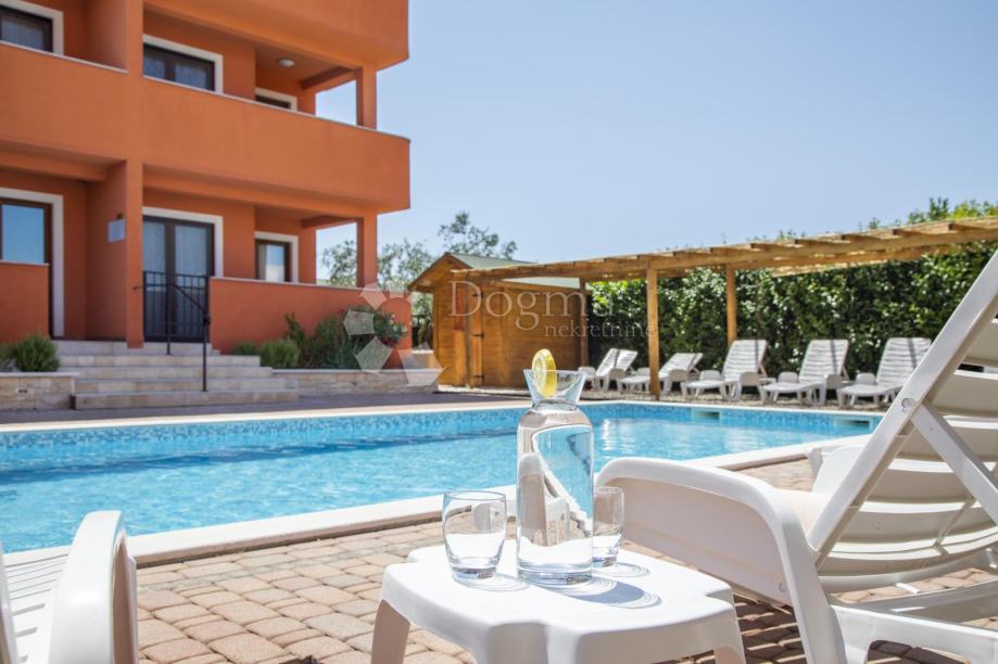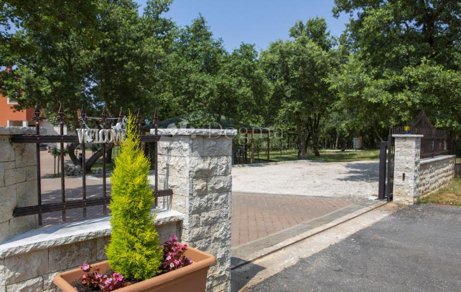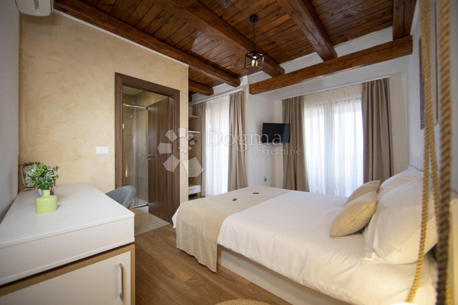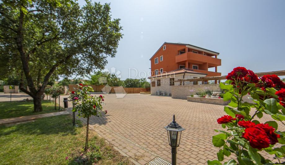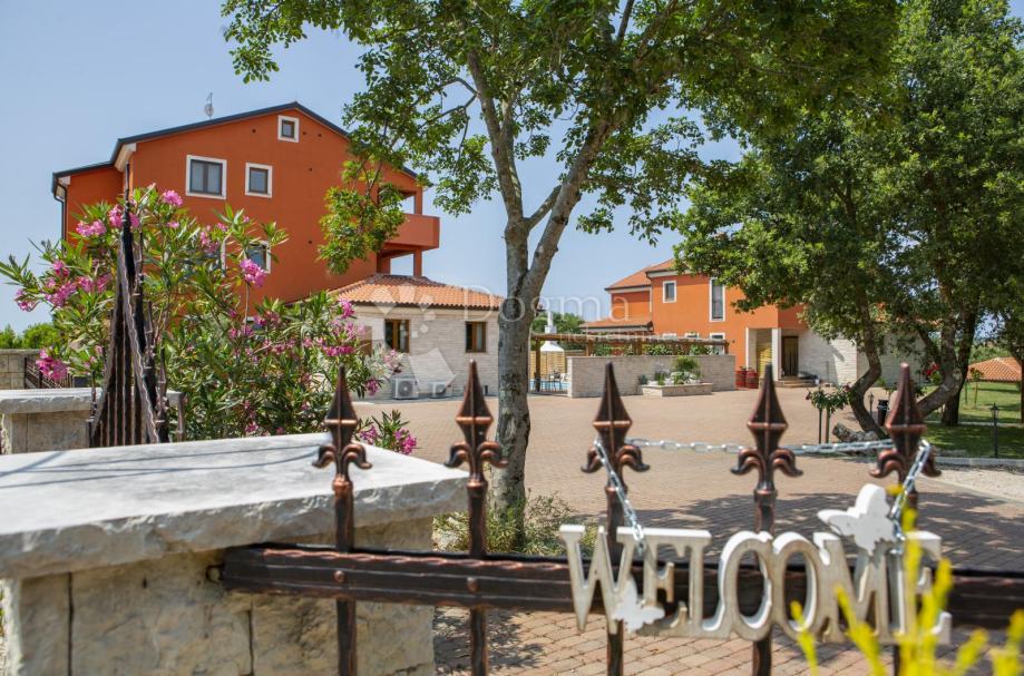 Ta čudovit družinski kompleks z raznoliko bivalno površino 1.475 m2 se nahaja znotraj omenjenega naselja. V kompleksu je trenutno ekonomsko in ekološko kvaliteten hotel v štirih nadstropjih 716 m2, s 15 dvoposteljnimi sobami, ki ima dobro uveljavljeno gostinsko dejavnost z restavracijo in ustrezno kulinariko, ki ustreza splošnim pogojem poslovanja gostinskih lokalov veliko večjih gostov. Vsaka soba v hotelu je unikatno opremljena z motivi mest Istre, ki gosta predstavi destinacijo, v kateri se nahaja, in je opremljena z visokokakovostnimi objekti in opremo, vsebuje čudovite terase in balkone za uživanje v sproščujočih trenutkih. . Ob vstopu ima hotel sodobno rustikalno recepcijo z barom, udobnim bivalnim prostorom in informacijsko sobo za goste, ki ima dostop do osupljivega ogrevanega bazena v sklopu hotela. Bazen je velik 55 m2 z ogrevano vodo, v sklopu bazena pa je plaža z ležalniki in terasa za uživanje v dobrotah domače družinske kuhinje, ločena savna, solna soba in čudovit ogrevan jacuzzi. Hotel je bil pred nekaj leti na novo zgrajen z visokokakovostnimi materiali in vsako leto si sistematično prizadevamo za izboljšanje kakovosti in ekonomičnosti objekta v obliki ogrevanja, plinske inštalacije, visokokakovostne klimatske naprave in solarnih panelov, ravnih streh, ki zbirajo vodo za vzdržujemo komarnike, pohištvo po meri v vseh prostorih, kamnito stopnišče in visoko kvalitetno keramiko v vseh enotah.