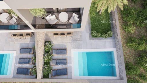 Na voljo je duplex hiša s bazenom. Sestavljala se bo iz pritličja in nadstropja. V pritličju se bosta nahajala vhodni del, spalnica, kopalnica, hodnik, kuhinja z jedilnico ter dnevna soba s teraso. Dnevna soba bo imela 5 metrov široko stekleno steno. Notranje stopnice vodijo v nadstropje, kjer sta dve spalnici, vsaka s svojo kopalnico (ena spalnica ima teraso). Spalnice bodo klimatizirane. Električne rolete in komarniki. Talno ogrevanje je predvideno v kopalnicah. Pametni sistem ogrevanja in hlajenja. Moderna arhitektura in dizajn. Na mirni lokaciji. Bazen. Dve parkirni mesti.