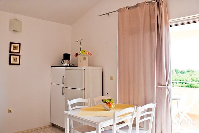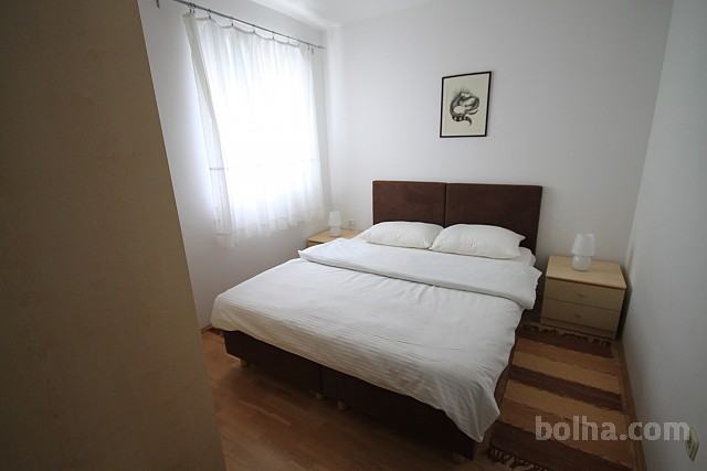 Pritličje: V pritličju se nahaja prostorno dvosobno stanovanje površine približno 60 m², z visokimi stropi in veliko dnevno sobo, ki so jo lastniki uredili za lastne potrebe. Stanovanje je obloženo s kamnitimi ploščami, iz dnevne sobe pa je izhod na bazen in zasebno teraso. Poleg tega je tukaj še enosobno stanovanje velikosti 41,5 m², namenjeno za oddajanje, ki lahko sprejme do 4 osebe, z neposrednim izhodom na bazen.