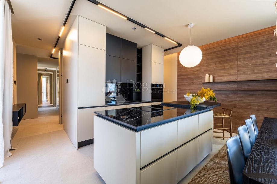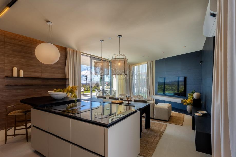 Salon, kuchnia i jadalnia to otwarta przestrzeń z imponującą, przeszkloną ścianą na całej wysokości, otwierającą się na taras słoneczny i podgrzewany basen. Kuchnia i sprzęt AGD marki Whirlpool są najwyższej jakości.