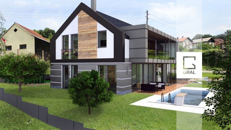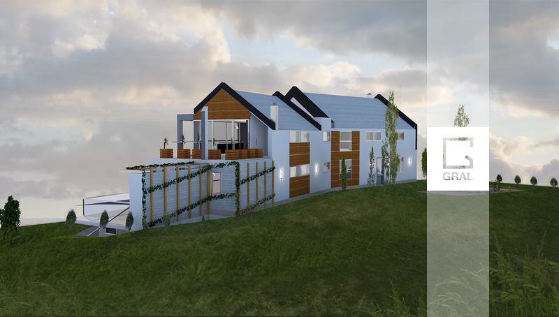 Slike, prikazane v tem oglasu, predstavljajo vizualizacijo stanovanjskega objekta in so objavljene z namenom predstavitve zunanjega izgleda hiše in delno notranjosti. V osnovi gre za že izdelan projekt za nadstandardno hišo s površino okoli 600 m2 bruto. Mogoča je tudi sprememba projekta.