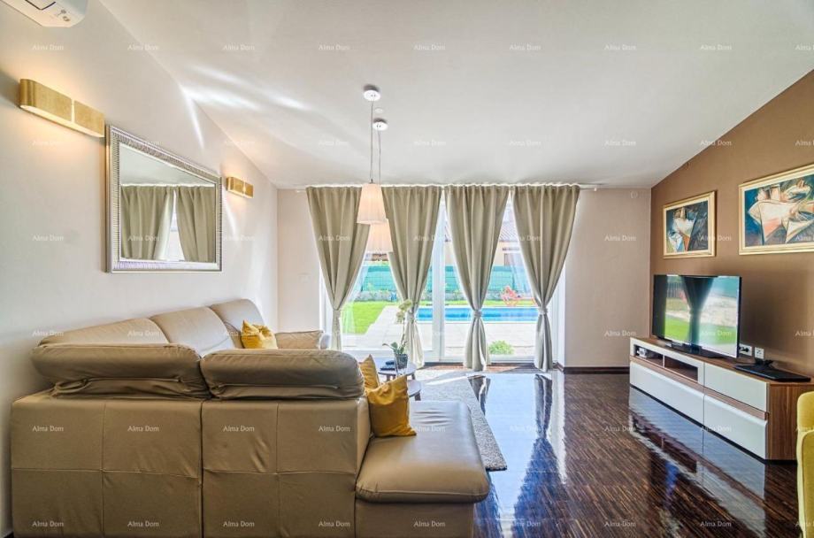 Ima taverno, teraso, ogrevan bazen 36 m2, teraso za sončenje, pokrito letno kuhinjo in WC. Sestoji iz stanovanjske enote: klet 49 m² in dve etaži 177 m².