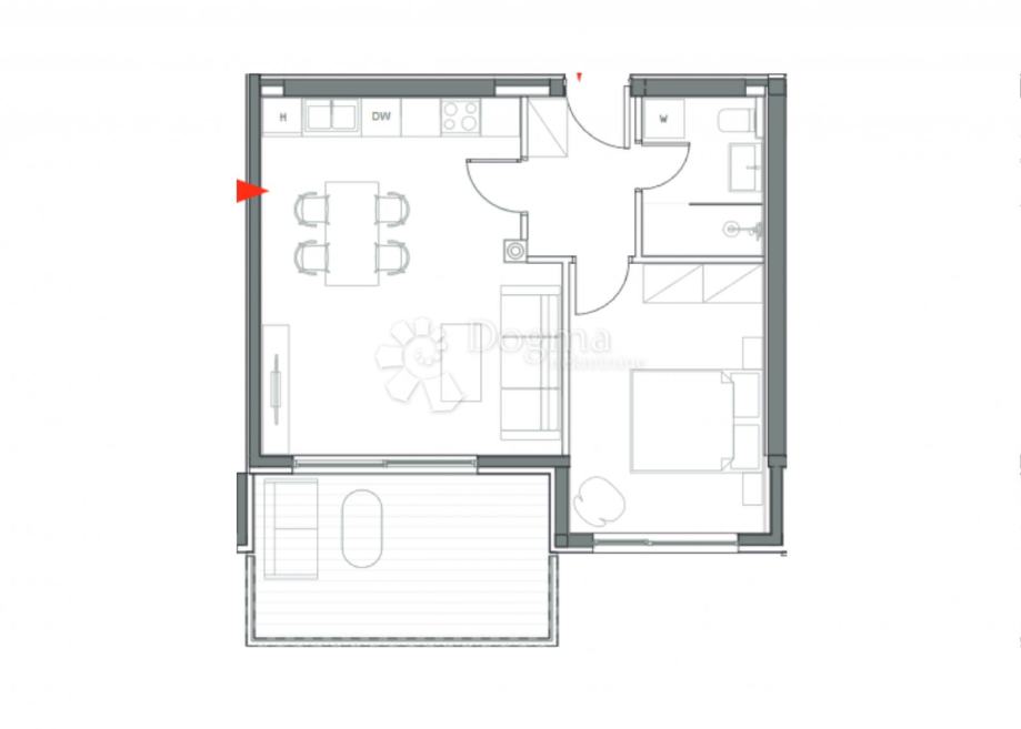 Sestavljen je iz predsobe, spalnice, kopalnice in prostorne dnevne sobe s kuhinjo in jedilnico.