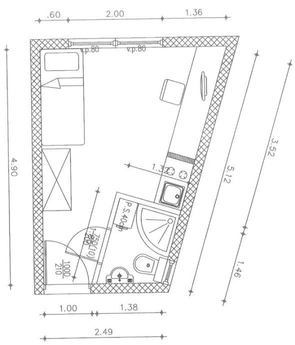 Razporeditev: kopalnica z WC-jem, kuhinja z jedilnico in spalnico