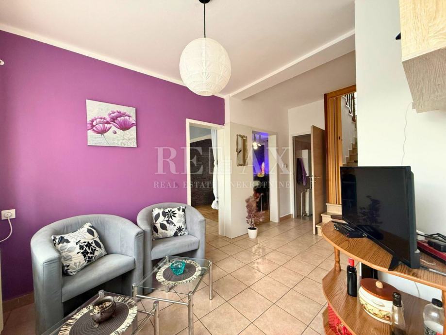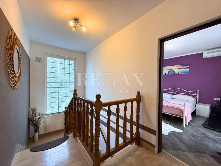 V pritličju se nahaja hodnik, ki vodi v kuhinjo z jedilnico, kopalnica ter dnevna soba s kaminom na drva, ki prostoru doda toplino in poseben ambient. Notranje stopnice vodijo v nadstropje, kjer so tri spalnice in dodatna kopalnica. Dve sobi imata izhod na skupen prostoren balkon s pogledom na morje, tretja pa ima lasten balkon.