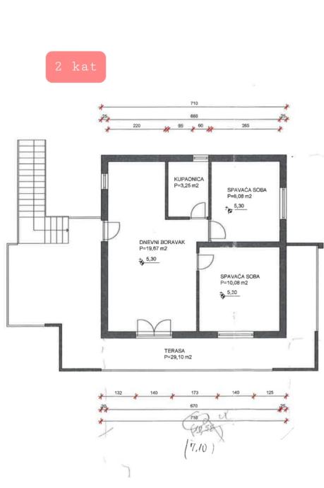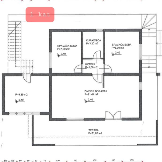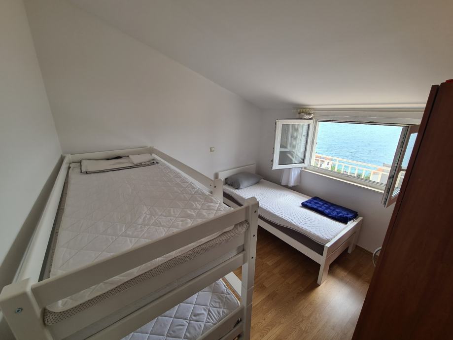 Stanovanje v 1. nadstropju (v solidnem stanju), 54 m², 3 spalnice (ena od njih je ločena z lastnim vhodom in čudovitim pogledom na morje), kuhinja z jedilnico, kopalnica, klimatska naprava.