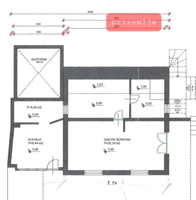 Pritličje (potrebno prenove), 55 m², 2-3 spalnice, kuhinja z dnevno sobo, kopalnica, hodnik, terasa, odprt pogled na morje, možnost preureditve v dvo- ali trisobno stanovanje, klimatska naprava.
