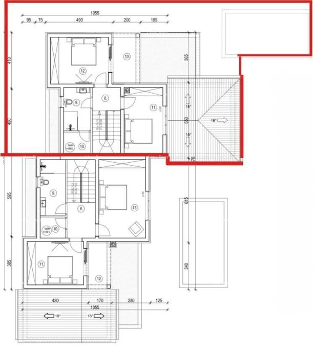 Stopnice vodijo v prvo nadstropje, kjer sta dve spalnici, kopalnica in pokrita terasa.