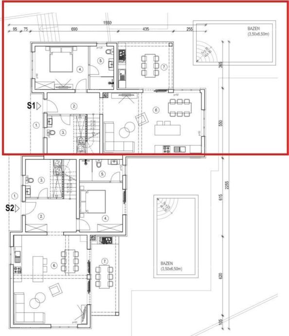 Vila ima površino 148,39 m² (neto površina 142,77 m²) in obsega pritličje in prvo nadstropje.