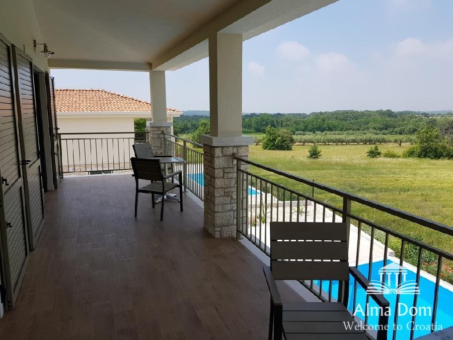 Vila je sestavljena iz štirih spalnic in štirih kopalnic (vsaka soba ima svojo kopalnico), dnevne sobe, kuhinje, jedilnice, stranišča, strojnice, na neto površini 141,47 m2, z dodatnimi uporabnimi površinami: teras na prvem nadstropje 25 m2, 9 m2, ter teraso v pritličju 25 m2 in teraso na bazenu 90 m2 in pokrito kuhinjo 6x2m. Skupna površina hiše s terasami je 290 m2.