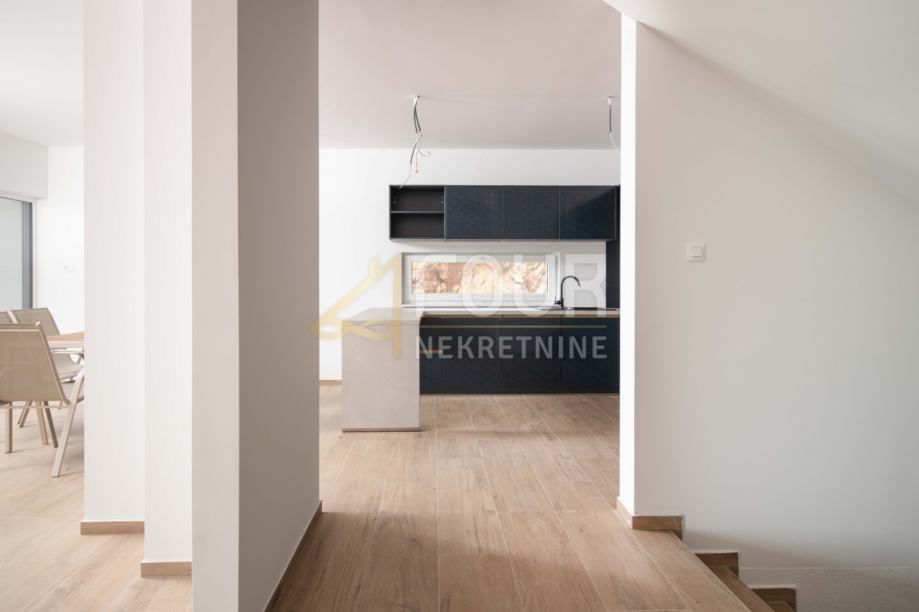 V nadstropju so tri elegantne spalnice, vsaka s svojo kopalnico, na južni strani pa se razprostira velik balkon s prekrasnim panoramskim razgledom na morje in kvarnerske otoke.