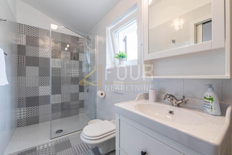 Popolnoma opremljena je s talnim ogrevanjem, klimatskimi napravami, PVC stavbnim pohištvom ter sistemom avtomatskega namakanja trate.