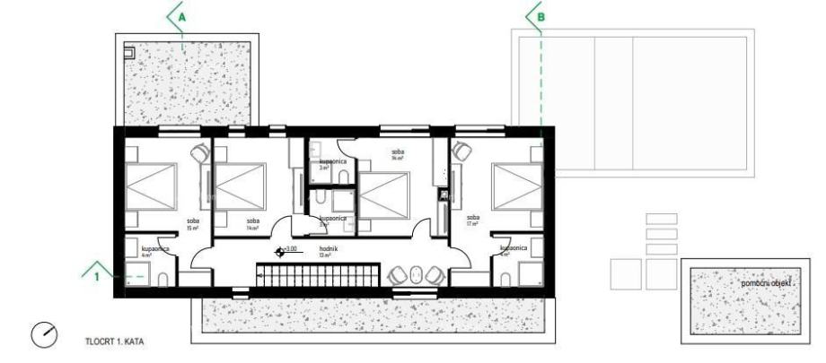 V nadstropju so hodnik, 4 spalnice z lastno kopalnico in izhodom na teraso.
