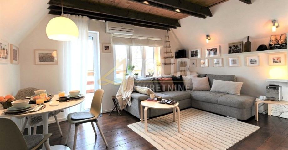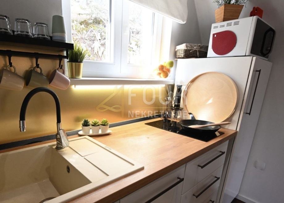 V pritličju se nahaja popolnoma opremljena kuhinja in dnevna soba v odprtem tlorisu z izhodom na teraso, ter kopalnica. V prvem nadstropju je udobna spalnica. Na dvorišču hiše je postavljena vrtna uta z zunanjim žarom, idealna za druženje na prostem.