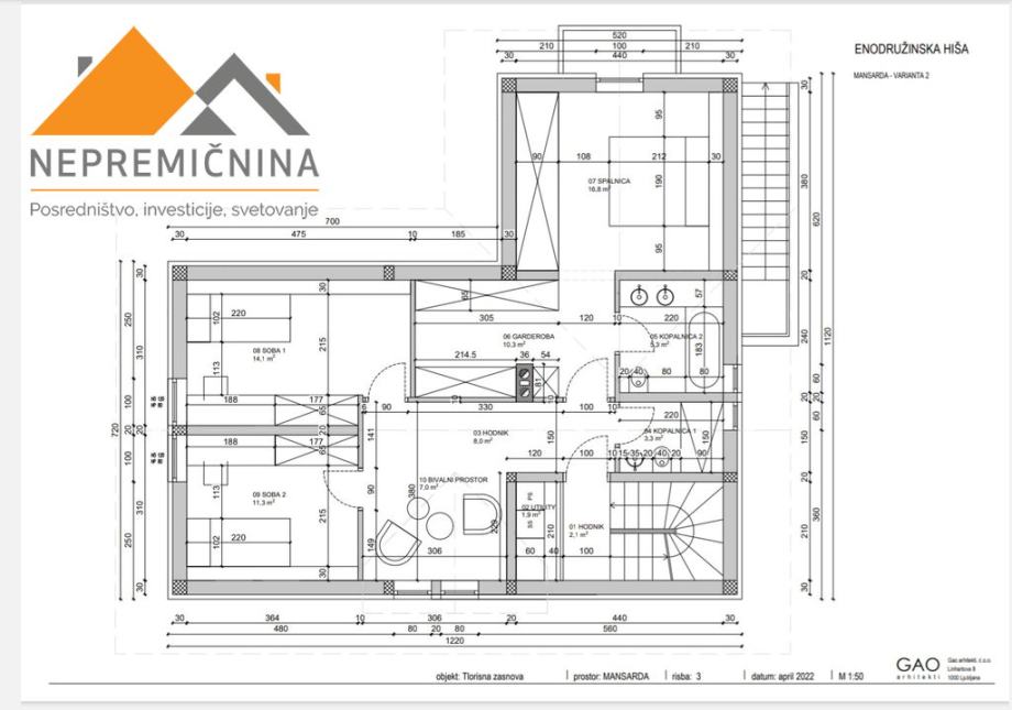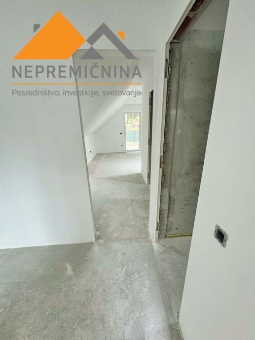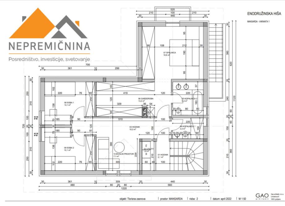 • Nadstropje obsega hodnik, bivalni prostor, spalnico z balkonom garderobno sobo, 2 x soba in 2 x kopalnica.