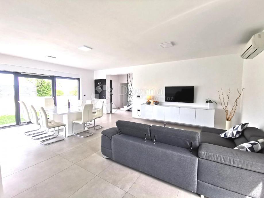 Predstavljamo vam to spektakularno vilo, ki je na voljo izključno v naši ponudbi in se nahaja v slikovitem Peroju. Ta luksuzna nepremičnina se razprostira na impresivnih 219,16 m2 in ponuja popolno mešanico modernega dizajna, udobja in razkošja. Vila je sestavljena iz pritličja in zgornjega nadstropja, njeno srce pa je odprt prostor v pritličju s prostorno dnevno sobo, elegantno jedilnico in moderno kuhinjo. Svetli odtenki in naravna svetloba ustvarjajo občutek svežine, zračnosti in prostornosti. V pritličju se nahaja tudi spalnica z lastno kopalnico ter pomožna soba. Velika steklena stena vas vodi na teraso, ki je delno pokrita in ponuja zunanjo jedilno garnituro ter uživanje ob 35 m2 velikem ogrevanem bazenu. Stopnice vodijo v zgornje nadstropje vile, kjer so tri prostorne spalnice, vsaka s svojo kopalnico. Dve kopalnici sta opremljeni s tušem, glavna spalnica pa ponuja hidromasažno kad za sprostitev po napornem dnevu. Vse sobe v prvem nadstropju so povezane z 21,92 m2 veliko teraso, ki ponuja čudovit razgled na morje, Brionske otoke in oljčne nasade. Vendar pa ta vila ne ponuja razkošja in udobja le za odrasle - vrt je opremljen z različnimi ugodnostmi za otroke, vključno s trampolinom, gugalnicami in namiznim nogometom. Zaradi tega je ta nepremičnina idealna za družine z otroki, kjer bodo tudi najmlajši člani našli svoj kotiček za igro in zabavo. Ta vila ponuja edinstveno priložnost za uživanje v ekskluzivnem in idiličnem okolju, vse z vrhunsko kakovostjo in stilom ter ugodnostmi za vso družino. Ne zamudite te priložnosti, da postanete lastnik te izjemne nepremičnine! Kontaktirajte nas zdaj in se dogovorite za ogled - Vaša nova oaza miru in užitka vas čaka!