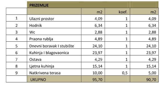 Hiša obsega v pritličju (površina 95,7 m2, neto 90,70 m2): predsobo, hodnik, dnevno sobo, kuhinjo, jedilnico, WC, shrambo, pralnico, letno kuhinjo in pokrito teraso.