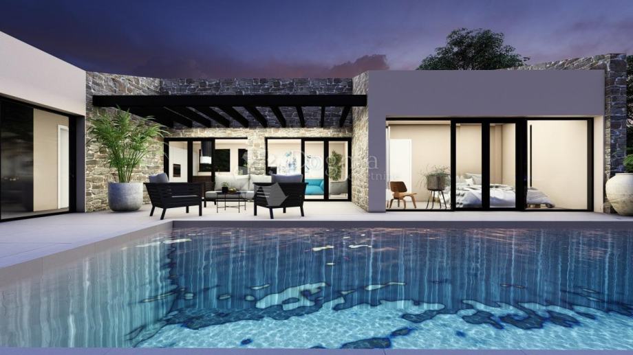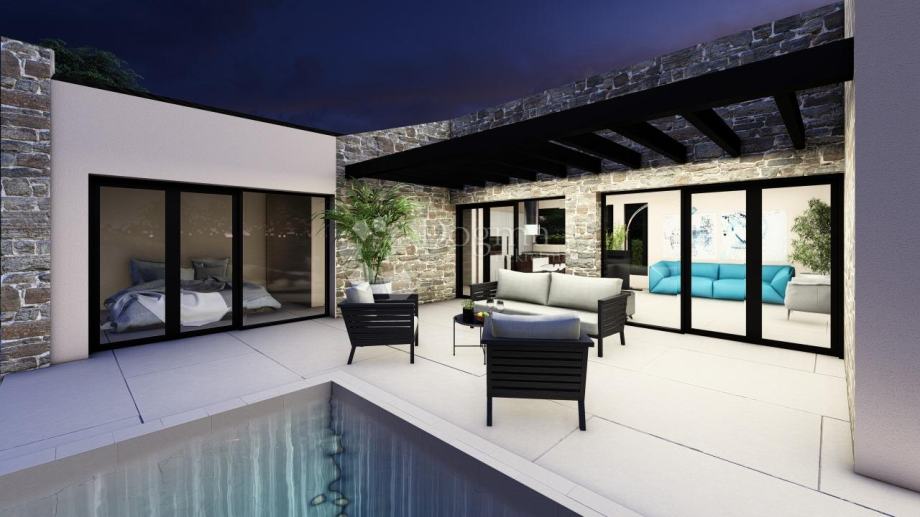 Hiša vključuje dve spalnici, dve luksuzni kopalnici, WC za goste, tehnično sobo in pralnico, ki povečujejo funkcionalnost prostora. Zunanjost je prav tako impresivna, saj se ponaša z bazenom dimenzij 9,5 x 3,5 m, obdan z obsežno teraso, ki je popolna za sončenje in sprostitev.