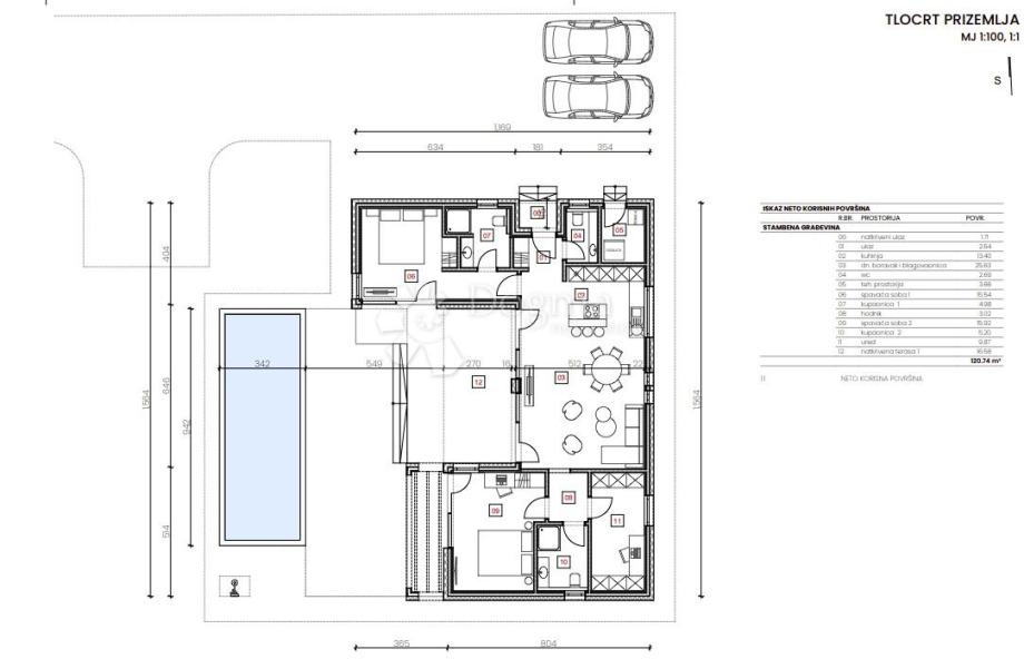Ta luksuzna enonadstropna hiša se razprostira na 120 m² bivalne površine, na parceli velikosti 700 m². Hiša je zasnovana kot popoln družinski dom, ki se osredotoča na udobje in sodoben življenjski slog. Osrednji del hiše sestavlja prostoren odprt prostor, ki združuje dnevno sobo, jedilnico in popolnoma opremljeno moderno kuhinjo, kar ustvarja idealen prostor za družinska srečanja in zabave.