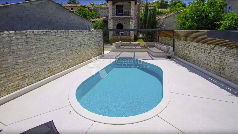Zunanji bazen, obložen z visokokakovostnimi italijanskimi ploščicami, je popoln prostor za sončenje in sprostitev. Ob bazenu se nahaja poletna kuhinja z žarom, terasa in zunanji tuš, ki so idealni za uživanje v poletnih mesecih. Velika ležalna postelja na terasi je udoben prostor za uživanje v blagih istrskih podnebnih razmerah.