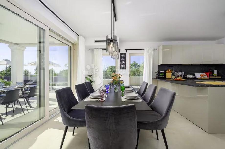 V pritličju se nahaja prostoren dnevni prostor v odprti zasnovi s sodobno, popolnoma opremljeno kuhinjo, jedilnico in dnevno sobo. Velike steklene stene odlično povezujejo notranjost s pokrito teraso in vrtom.