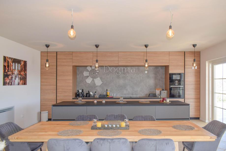 Dnevni prostor v pritličju vodi na teraso, ki se povezuje z lepo vzdrževanim vrtom z infinity bazenom in prostorno sončno teraso, ki je idealna za uživanje v zasebnosti. V vrtu je tudi elegantna poletna kuhinja, opremljena z vsemi potrebnimi napravami, prav tako kopalnica in savna, kar je idealen prostor za sprostitev in uživanje v družbi družine in prijateljev.