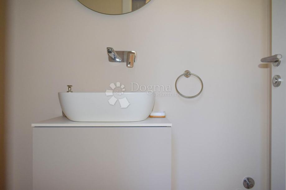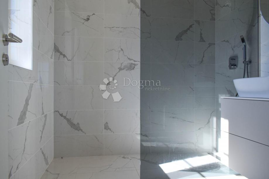 Vila je razporejena v dveh etažah. V pritličju se nahaja eleganten vhodni hodnik, ki vodi v prostorno dnevno sobo, kuhinjo in jedilnico odprtega koncepta, ki je polna naravne svetlobe zaradi velikih steklenih površin. Ta prostor je zasnovan za uživanje in sprostitev, s neposrednim izhodom na veliko pokrito teraso, ki popolnoma povezuje notranji in zunanji prostor. V pritličju je tudi luksuzna spalnica s privatno kopalnico in gostinjski WC za dodatno udobje. V dnevni sobi je tudi kamin, ki še dodatno povečuje luksuzno vzdušje te čudovite vile.