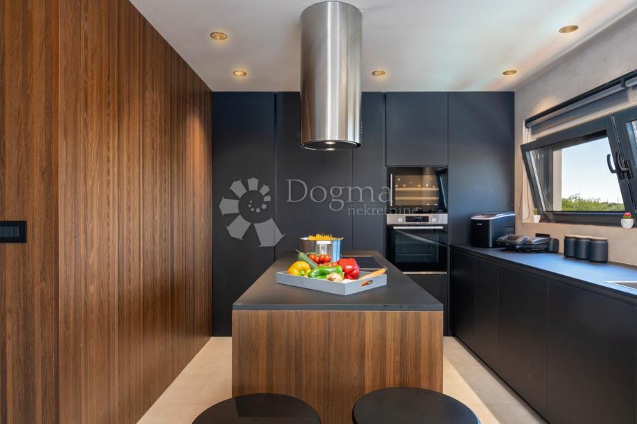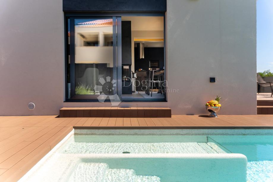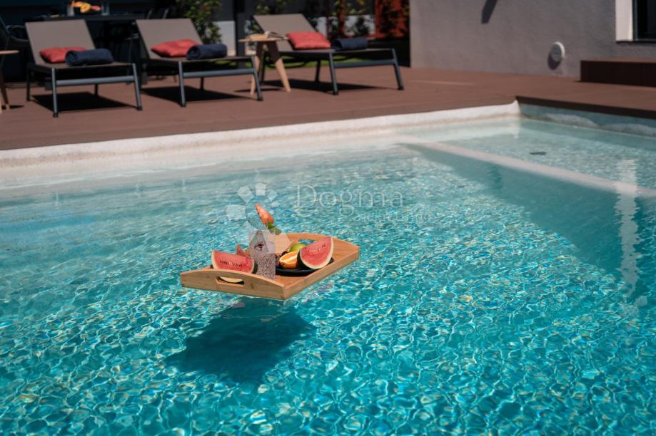 Oaza miru se nadaljuje z zunanjo kuhinjo in jedilnim nizom, ki zagotavlja popolno kuliso za poletne večere. Vsaka priprava obroka v tej odprti kuhinji bo še bolj zabavna, medtem ko vaši najdražji uživajo v ogrevanem bazenu ali se sončijo na ležalnikih v sprostitveni coni te čudovite vile.