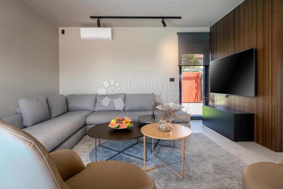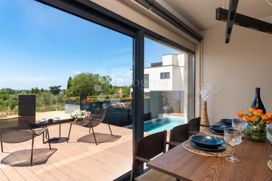 Prostor je zaradi velikih steklenih sten osvetljen z naravno dnevno svetlobo, iz dnevne sobe pa je enostaven dostop do zunanjega prostora za sprostitev in bazena.