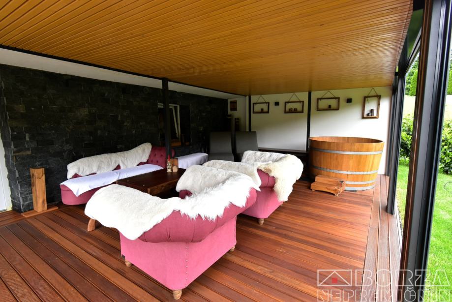 -pritličje: večji bivalni del s kuhinjo/savno/kadjo, spalnico, kopalnico, zaprto teraso