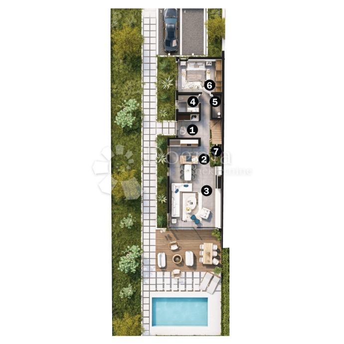 Sestavljajo ga kar 3 spalnice (od tega 2 z lastno kopalnico), 3 kopalnice, prostorna dnevna soba s kuhinjo in jedilnico ter dostop do urejenega vrta s prostorom za sončenje, bazenom in 2. parkirni prostori.