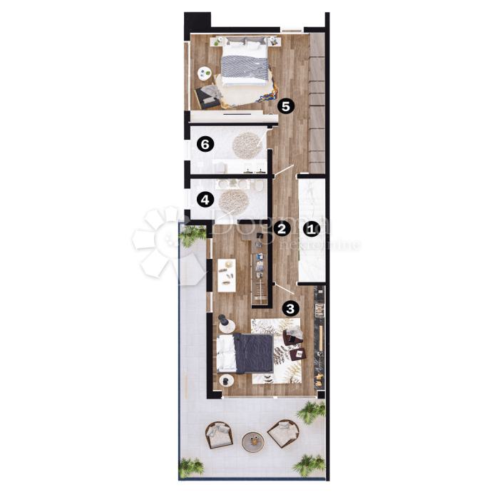 Sestavljajo ga kar 3 spalnice (od tega 2 z lastno kopalnico), 3 kopalnice, prostorna dnevna soba s kuhinjo in jedilnico ter dostop do urejenega vrta s prostorom za sončenje, bazenom in 2. parkirni prostori.