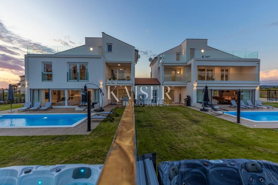 Kaiser Immobilien vam predstavlja samostojno vilo z bazenom in pogledom na morje v bližini Poreča. Hiša je sestavljena iz pritličja in dveh nadstropij, s šestimi spalnicami, tremi kopalnicami, straniščem, dnevno sobo, kuhinjo, hodnikom in shrambo. Je luksuzno in moderno opremljen. Vsebuje kotlovnico za centralno ogrevanje, toplotne črpalke. Na vrtu je bazen z vrtom. Ima tudi jacuzzi in savno.Vila se nahaja v mirnem delu mesta. Idealna hiša za prijeten dopust.