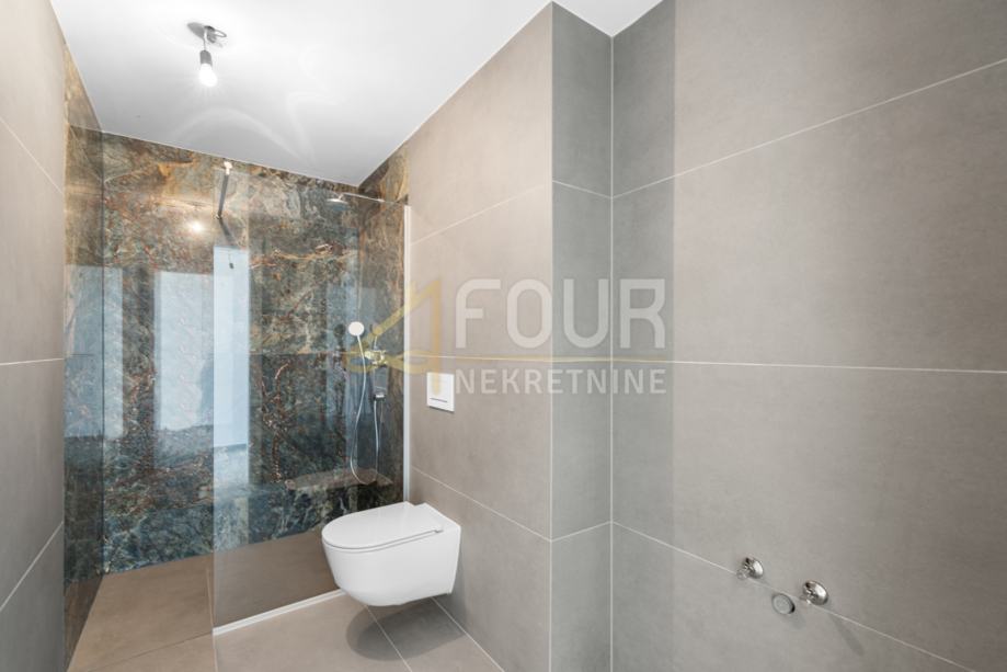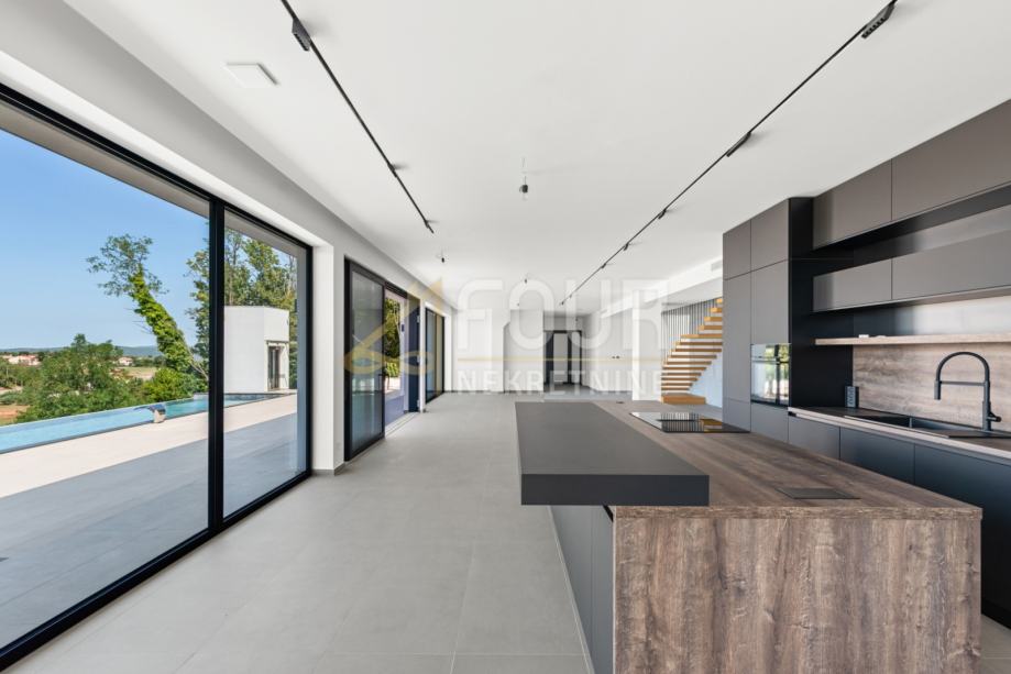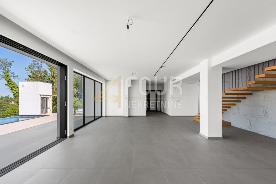 Dvorišče velikosti 844 m2 je urejeno s tradicionalnimi rastlinami, ki dodatno prispevajo k prijetnemu ambientu. Prav tako je na voljo impresivna zunanja oprema - infinity bazen velikosti 48 m2 s tlakovanjem za sončenje velikosti 100 m2 in zunanja letna kuhinja z žarom. Na voljo so štiri parkirna mesta, od katerih je eno opremljeno s polnilnikom za električna vozila.