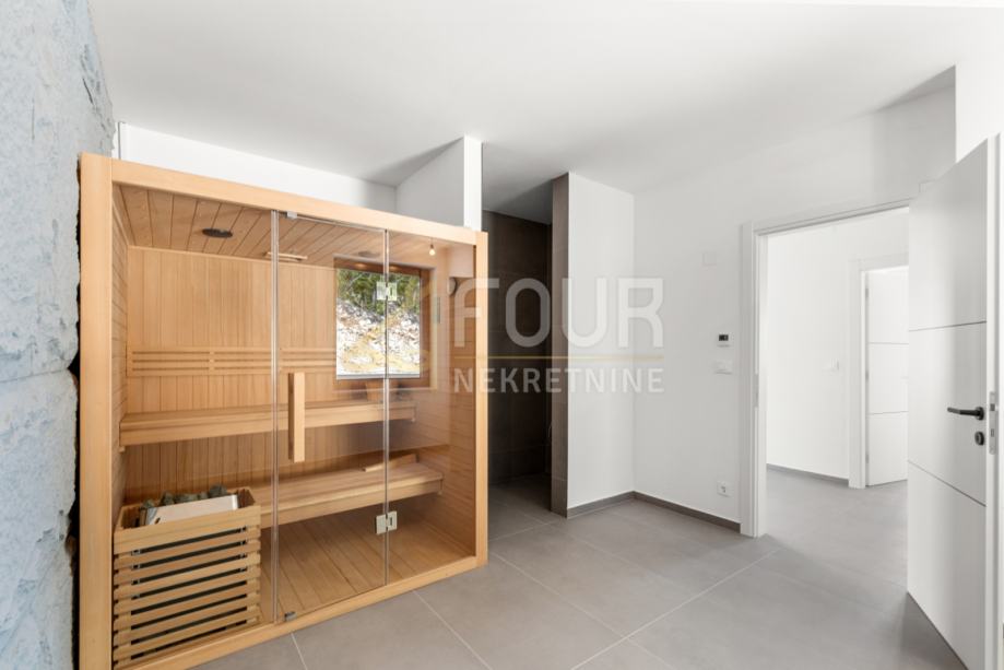 V pritličju se nahaja velik odprt prostor dnevne sobe s kaminom, jedilnico in kuhinjo, kopalnica ter dodatni prostori – fitnes, wellness s savno in tušem, tehnični prostor in še ena soba – idealna za delovno sobo, igralnico in podobno. V nadstropju so štiri spalnice z lastnimi kopalnicami in prostorna terasa velikosti 81,46 m2. Vse sobe imajo čudovit panoramski pogled. V kleti se nahaja kotlovnica.
