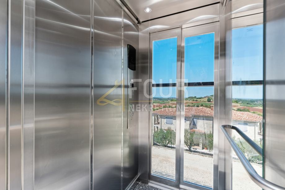 Vila je opremljena z zunanjim steklenim dvigalom, ki omogoča lahek dostop do vseh ravni ter dodaja pridih elegance in modernosti.
