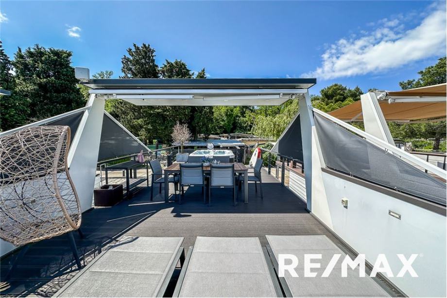 Na zgornji terasi pa se poleg velike jedilne mize nahaja tudi jacuzzi.