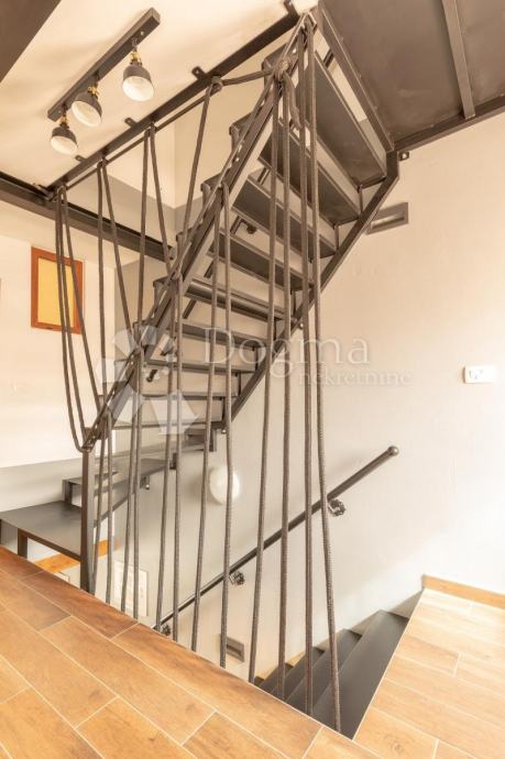 APARTMA 2 - enako se razprostira v pritličju, 1. in 2. nadstropju. V pritličju je kuhinja z jedilnico, dnevna soba in WC. Dizajnerske stopnice iz železnega materiala vodijo v 1. nadstropje, kjer sta 2 spalnici z 1 kopalnico, v 2. nadstropju pa je še ena spalnica z lastno kopalnico in shrambo.