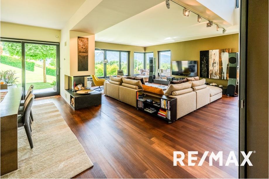 Že ob vstopu vas bo očaral razkošen dnevni prostor z visokimi stropi in velikimi steklenimi površinami, usmerjenimi proti jugu in zahodu. Dnevna soba je povezana z jedilnico in moderno kuhinjo s kuhinjskim otokom, vse skupaj pa prehaja na zunanjo teraso s prostornim bazenom (9,5 m x 3,5 m) in leseno teraso (50 m²). Med jedilnico in dnevnim prostorom se nahaja odprt kamin, ki daje prostoru poseben ambient.