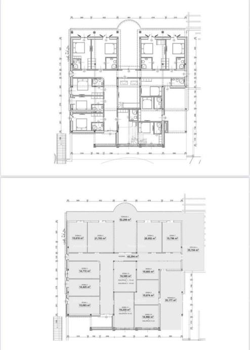 Zgornje nadstropje: 400 m² v nedokončani fazi, idealno za 12 sob ali hišo za najem s kapaciteto do 20 oseb.