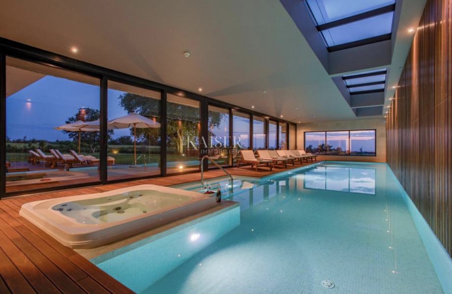 Kaiser Immobilien predstavlja moderno, luksuzno vilo, ki nudi popolno zasebnost v mirnem okolju pristne istrske vasice na zahodni obali Istre, nedaleč od Baderne in mesta Poreč - mesta kulture, turizma, športa in zabave. Osnovni podatki: Površina parcele: 4.200 m2 urejenega mediteranskega vrta, obdanega z oljkami Bivalna površina: 470 m2 v dveh etažah (pritličje in nadstropje) Leto izgradnje: 2018 Popolnost razkošja in oblikovanja: Vila je zgrajena iz najkakovostnejših materialov in opremljena s sodobno tehnologijo, vključno s sistemom za zaščito, nadzor in upravljanje Smart Home. Spalnice: 4 prostorne sobe, vsaka z lastno kopalnico Dodatne sobe: Moderno zasnovana dodatna kopalnica, jacuzzi, savna in telovadnica Zunanjost: Letna kuhinja in prostorne terase idealne za sprostitev in druženje Vila ima impresiven notranji bazen velikosti 70 m2 (18 m dolg ), katerega steklene stene lahko poleti odpremo in doživimo popolno zlitje notranjega in zunanjega prostora, pozimi pa nudi topel, prijeten ambient za sprostitev. Eleganca notranjosti: Vsaka podrobnost je skrbno izbrana za ustvarjanje prefinjenega in ekskluzivnega ambienta, ki odlično dopolnjuje razkošno okolje in estetiko prostora. Vila predstavlja popolno kombinacijo izjemnega stila in udobja. Vsak prostor vile je zaradi velikih steklenih površin osvetljen z naravno svetlobo. Prostor izžareva razkošje zahvaljujoč: Hrastovim podom s talnim ogrevanjem Vrhunski kuhinji, opremljeni z najsodobnejšimi aparati Elegantni dnevni sobi, povezani z zunanjim prostorom Strešni terasi ponuja čudovit panoramski pogled na neokrnjeno naravo in morje, kar zagotavlja edinstveno vzdušje za užitek in sprostitev. Oddaljenost od mest EU: Trst: 49 km Ljubljana: 160 km München: 560 km Dunaj: 540 km Budimpešta: 572 km Letališča: Letališče Pula: 50 km Letališče Trst: 122 km Ta vila je kot nalašč za razkošno življenje v sožitju z naravo na zahodna obala Istre. Za dodatne informacije in dogovore za ogled nas kontaktirajte na: