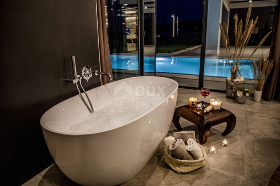 LIŽNJAN - majhno naselje jugovzhodno od Pule, ki leži na pobočju, ki se spušča proti morju, le 2 km od prvih plaž. Poleg tradicionalnega kmetijstva se prebivalci ukvarjajo tudi s turizmom. Med domačini in turisti poznana kot mirna lokacija idealna za dopust in sprehod ob morju z odprtim pogledom na otoka Cres in Lošinj. Vsako leto privablja vse več turistov, k temu pa pripomore tudi nedavna odločitev za izgradnjo sodobnega hotela s 5 zvezdicami. Ob gradnji novega hotela se vlaga tudi v prenovo infrastrukture in s tem pestrost ponudbe. Ta popolnoma nova počitniška vila se nahaja na tej lokaciji, le 600m od prve plaže. Je sodobna arhitekturna znamenitost in ena najlepših hiš v Istri, ki jo hvalijo najuglednejše hrvaške revije. S čudovitim pogledom na morje ter otoka Cres in Lošinj vas bo zagotovo očaral tako z notranjim in zunanjim dizajnom kot tudi kakovostjo izvedbe. Uživate lahko v vsem udobju te vile v njeni 328 m2 bivalne površine, ki je razdeljena na dve etaži. Tako se v prostornem in zračnem pritličju, v večjem »open space« prostoru, nahaja lepa in moderna dnevna soba, ki jo skozi velike steklene stene osvetljuje dnevna svetloba. V moderni kuhinji, ki je opremljena s tehnikami, pod katere se podpisujejo vrhunski svetovni izvajalci in oblikovalci, lahko pripravite najokusnejše dobrote. Enake dobrote lahko z družino in prijatelji uživate v jedilnici, ki ločuje dnevno sobo od kuhinje. Poleg tega se v pritličju nahaja ena od spalnic z lastno kopalnico in izhodom na dvorišče ter ločeno stranišče za goste. Iz pritličja je skozi stekleno steno izhod na pokrito zunanjo teraso in čudovit »Infinity« bazen ter lepo sončno zeleno dvorišče. Notranje stopnišče vodi v zgornje nadstropje, kjer se nahajajo 3 prostorne, moderno urejene in osvetljene spalnice, od katerih ima vsaka svojo kopalnico. Naravno svetlobo v sobah zagotavljajo večje steklene stene, ki poskrbijo, da je bivanje še toliko prijetnejše, sobe pa prostornejše. Celotno zgodbo zaokroža urejeno in vzdrževano dvorišče velikosti 770m2. Dvorišče je v celoti ograjeno, s čimer je dosežena želena stopnja varnosti in zasebnosti. Za lepo zelenico skrbi avtomatski namakalni sistem, zagotovljeno pa je tudi parkirišče za 6 avtomobilov. Osrednji del dvorišča zavzema prečudovit "Infinity" bazen velikosti 42m2 s prostorom za sončenje, je "infinity", to je dotočni bazen s treh strani, medtem ko je na eni strani masivna steklena stena, ki daje učinek akvarija. Bazen je opremljen z najsodobnejšo tehniko za čiščenje vode s povečanim terapevtskim učinkom, saj se klor pridobiva z elektrolizo iz soli po naravni poti, ter sterilizacijsko UV svetilko. Bazen je dodatno ogrevan z invertersko toplotno črpalko + sistem sončnih kolektorjev, ki se nahajajo na strehi, zaradi česar je vaše kopanje prijetno tudi v trenutkih po poletni sezoni. DODATNE INFORMACIJE: * Vila je opremljena s pametnim klimatskim sistemom za ogrevanje in hlajenje + talno ogrevanje v vseh prostorih. * Na zunanjih stenah je bila nameščena 15 cm izolacija * Vila je primerna za invalide, saj je celotno pritličje brez stopnic in je v enem nivoju, vključno s spodnjim prostorom. * Prikazane cene vključujejo % DDV