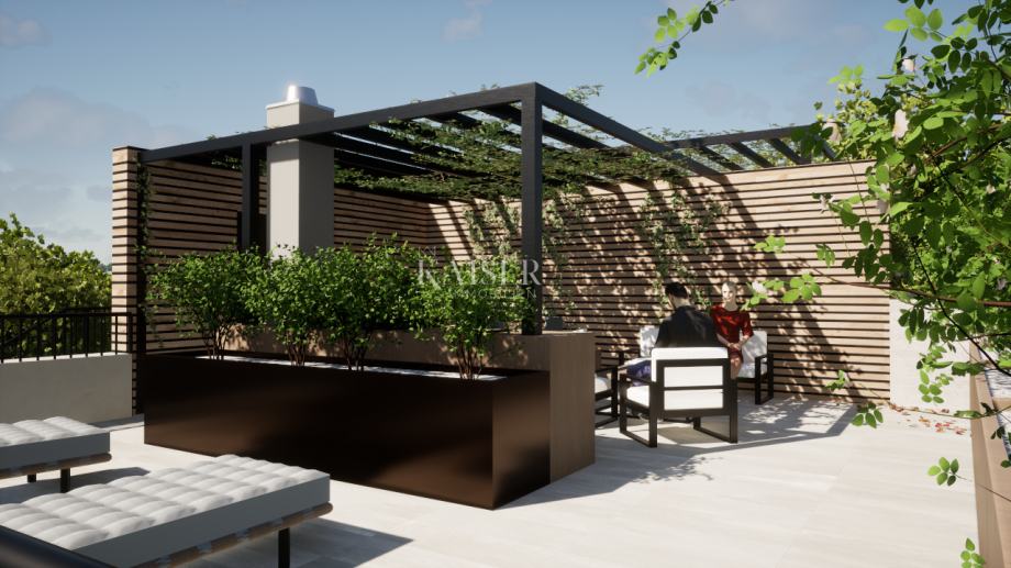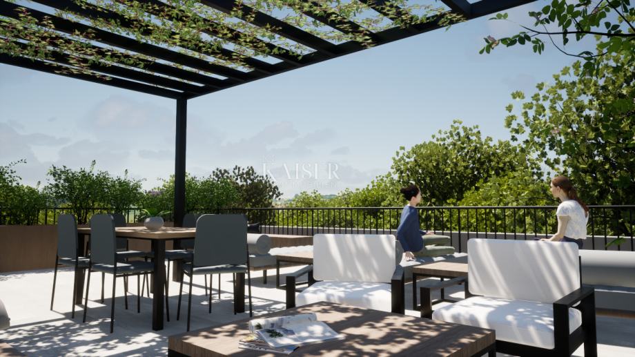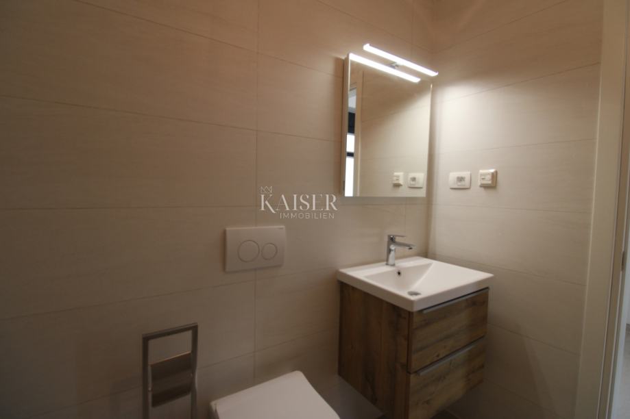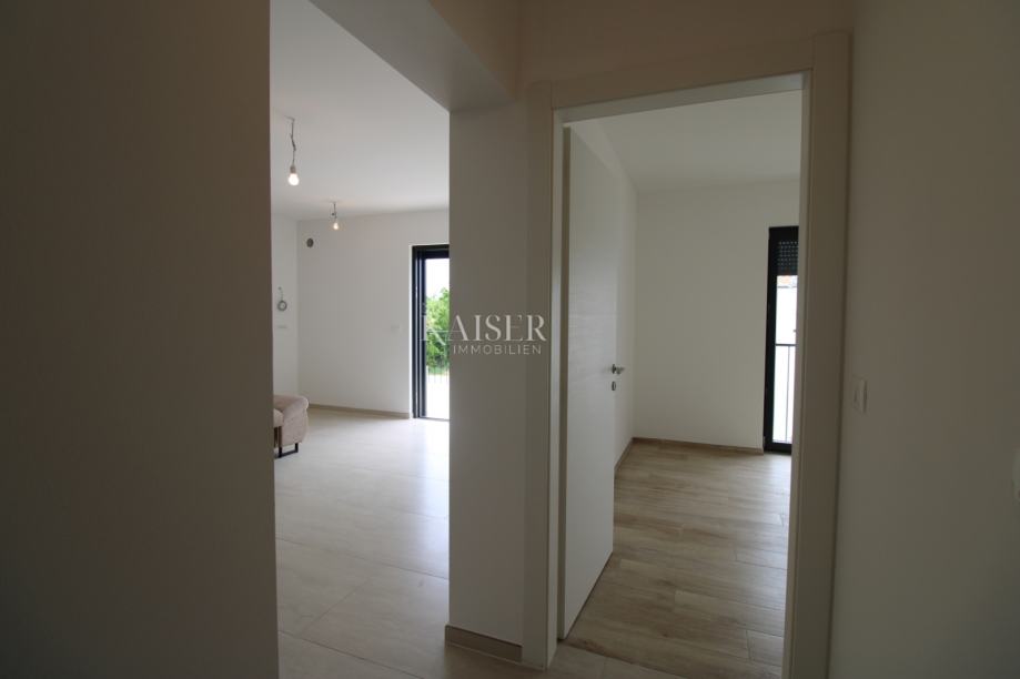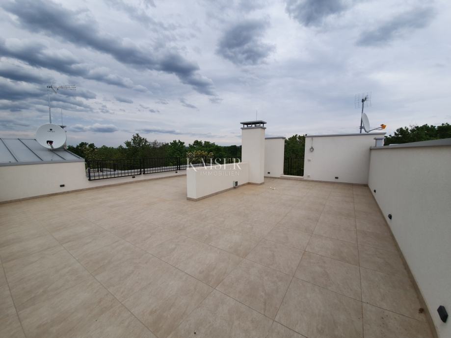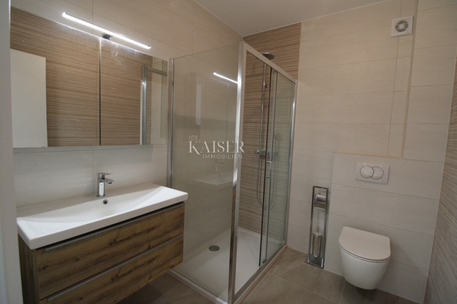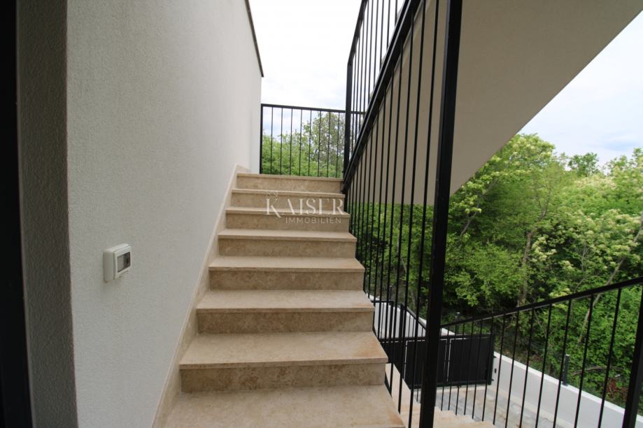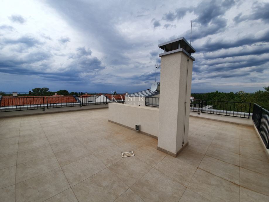 Kaiser Immobilien ponuja v prodajo čudovito stanovanje v novogradnji s pogledom na morje. Apartma se nahaja le 6 km od mesta Poreč, prvih plaž, in 1 km od osnovnih vsebin, kot so trgovina, restavracija, šola, vrtec, kozmetični salon, itd. To čudovito stanovanje se nahaja v mirnem okolju, v popolnoma novem manjšem objektu na samem robu gozda in narave. Lokacija apartmaja vam zagotavlja popoln mir, vonj po naravi in oazo sprostitve ob vsakodnevnem žvrgolenju ptic in vetriču, ki prihaja iz sosednjega gozda. Objekt je manjše kapacitete in ima skupno pet stanovanj, kar vam dodatno zagotavlja mir in zasebnost. Apartma se nahaja v prvem nadstropju stanovanjske stavbe z neustavljivim pogledom na morje od Poreča do Novigrada. Posebnost in neustavljiva prednost tega stanovanja v primerjavi z ostalimi stanovanji je, da ima stanovanje celotno strešno teraso v izmeri 75 m2. Terasa ponuja različne možnosti, ki jih lahko dodate in še dodatno uživate v svojem novem domu, in vse to ob fantastičnem razgledu. Apartma velikosti 83 m2 obsega dve spalnici, kopalnico in stranišče za goste, kuhinjo in jedilnico, prostorno dnevno sobo in neustavljivo udobno zunanjo teraso. V ceno stanovanja je v celoti vgrajena kvalitetna keramika, sanitarna keramika, kvalitetna klima in kvalitetno mizarstvo. Stanovanje je ogrevano na več možnosti, tla v kopalnici in WC-ju se ogrevajo preko talnega gretja, za ogrevanje in hlajenje stanovanja so vgrajene vrhunske klimatske naprave Mitsubishi, v stanovanju je tudi dimnik, ki daje možnost vgradnje peči ali kamina po potrebi. Dimnik tega stanovanja je ločen od dimnika spodnjega stanovanja, tako da se dim ne meša. Stanovanju pripadata dve parkirni mesti, vsako na svojem parkirišču, kar zagotavlja, da nihče ne zapre vašega vozila s svojim vozilom. Oddaljenost nepremičnine od mesta: Poreč - Letališče Pula, 45 km Poreč - Ljubljana, 162 km Poreč - Dunaj, 544 km Poreč - Praga, 868 km Poreč - München, 565 km Če želite to čudovito stanovanje s strešno teraso in neustavljivega pogleda, da postane vaš novi dom, kontaktirajte agenta na telefonsko številko 00385 923782803 ali na elektronski naslov: ivana@kaiser-immobilien.hr. Agencijska provizija znaša 3% + DDV.
