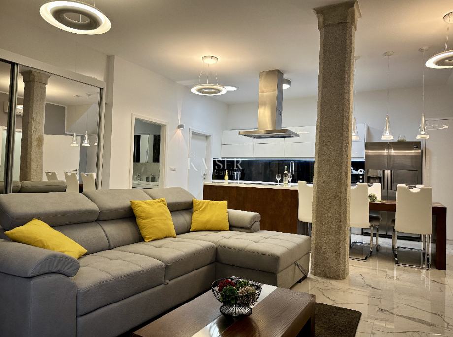 Kaiser Immobilien ponuja v prodajo luksuzno prenovljeno hišo v samem centru Poreča. Na oddaljenosti le 50 m od morja ob zvokih poletnih turističnih prireditev se skriva edinstvena zgradba z elementi moderne arhitekture. Hiša je bila v celoti prenovljena leta 2017, z dodatkom modernih elementov v zgodovinski luksuzni objekt. Razdeljeno je na skupno tri etaže, od katerih ima vsaka ločeno samostojno stanovanje z ločenim vhodom. Zaradi odlične lokacije so vsi pomembni objekti v neposredni bližini, morje pa le 50 m od nepremičnine. Velikost hiše je 310 kvadratnih metrov, dvorišče pa 32 kvadratnih metrov. Stanovanje v pritličju meri 95,3 m2 in je sestavljeno iz hodnika, spalnice z lastno kopalnico in izhodom na dvorišče. Udobna dnevna soba, s kuhinjo in jedilnico ter izhodom na idilično teraso in urejeno dvorišče, spalnica, velika kopalnica s kadjo in tušem, pralnica. Pri adaptaciji je bilo poskrbljeno za ohranitev originalnih detajlov, kot so kamniti stebri in stara opeka, kar daje tej hiši poseben zgodovinski čar. Dodatne lastnosti stanovanja: Talno gretje v celotnem stanovanju Komarniki na oknih Klima v vseh prostorih Video domofon za dodatno varnost Priključek vode na dvorišču za letno kuhinjo ali jacuzzi Solarna cev za naravno osvetlitev. 1. nadstropje v izmeri 113,51 m2 obsega predsobo, veliko dnevno sobo z jedilnico in nekoliko ločeno kuhinjo, tri spalnice in dve kopalnici. Kuhinja in kopalnice imajo talno gretje, v vseh prostorih pa so nameščene klimatske naprave. Komarniki na oknih Klimatske naprave v vseh prostorih Video domofon za dodatno varnost Mansarda površine 69,83m2 obsega dnevno sobo, kuhinjo in jedilnico, kopalnico in spalnico. Vse sobe so tudi popolnoma klimatizirane. To stanovanje ponuja praktičnost in udobje z veliko vgradnimi omarami in predalniki, prostor je organiziran in prilagojen vsakdanjemu življenju. V kopalnici je tudi talno ogrevanje. Vsako stanovanje ima svoj števec električne energije. Hiša je bila leta 2017 v celoti in kvalitetno prenovljena. Oddaljenost nepremičnine od mesta: Poreč - Letališče Pula, 45 km Poreč - Ljubljana, 162 km Poreč - Dunaj, 544 km Poreč - Praga, 868 km Poreč - München, 565 km Če želite, da ta čudovita hiša postane vaš novi dom , nas z zaupanjem kontaktirajte na telefonsko številko 00385 923782803 ali na elektronski naslov: ivana@kaiser-immobilien.hr. Agencijska provizija znaša 3% + DDV.
