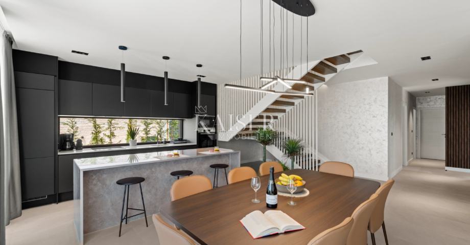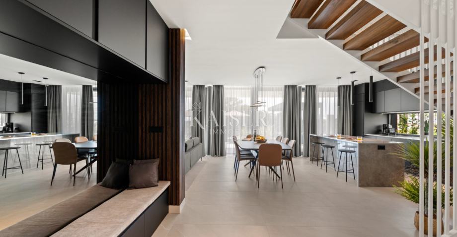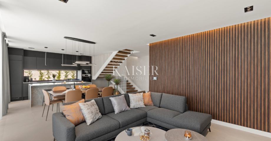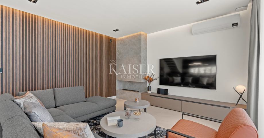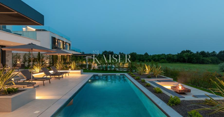 Kaiser Immobilien s ponosom predstavlja moderno in luksuzno samostojno vilo, ki se nahaja le 5 km od mesta Poreč, ki se prodaja popolnoma opremljena. Vila se nahaja v priljubljenem turističnem letovišču v bližini mesta Poreč, obkrožena s popolno naravo, mirom in tišino, pa vendar blizu vseh potrebnih dobrin za življenje. Vila je bila zgrajena z vrhunskimi materiali, s pozornostjo do vsake podrobnosti, da bo življenje v vili čim bolj preprosto in luksuzno za bodočega lastnika. Vila je v celoti opremljena in se kot taka tudi prodaja. Vila vsebuje vse zahteve dovoljenja in jo je možno tudi najeti. Bruto površina vile je: 267 m2 (upoštevane so samo zaprte površine) Neto površina notranje bivalne površine: 204 m2 (zaprta površina) Neto površina pokrite in nepokrite površine: 310 m2 (sončnik, nadstrešek, balkoni, poti, kurišče, strešna terasa in zunanje stopnišče) Parkirišče: vila ima 3 parkirna mesta za avtomobile in eno za kolesa (skupna parkirna površina cca 50 m2) Bazen - 35 m2 vodne površine Energijski razred: A (20 kWh/m2 letno) Etažnost: P+1 (pritličje + nadstropje), grajeno v klasični gradnji. Novogradnja. Pogled na morje. Pritličje obsega predsobo, stopnišče v nadstropje in strešno teraso, dnevno sobo, kuhinjo in jedilnico, spalnico z ločeno kopalnico, dodatno stranišče, kopalnico in savno, tehnične prostore s pralnico in shrambo ter zunanje stranišče, vsaka z ločenim vhodom. V prvem nadstropju je stopnišče, hodnik, tri spalnice z ločenimi kopalnicami in popolnoma opremljena delovna soba. Stopnišče za dostop do strešne terase, ki ima zunanji bar, teraso za sončenje in masažno kad. Okolica obsega zunanji ogrevan bazen, prostor za sončenje, pokrito jedilnico, nadstrešek z letno kuhinjo in nepokrito teraso tik ob bazenu. V spodnjem delu dvorišča je kurišče. Na dvorišču je tudi dizajnerska zunanja prha s toplo vodo in talni odtok. Nosilna konstrukcija glavnega objekta sloni na pasovnih temeljih, zidovi pa so kombinacija opečnih blokov in armiranobetonske konstrukcije. Talne in strešne plošče so iz armiranega betona. Zunanji nadstrešek iz jeklene konstrukcije. Predelne stene so klasično zidane z opečnimi bloki. Nakup električne energije je 18,86 kW – trifazni.