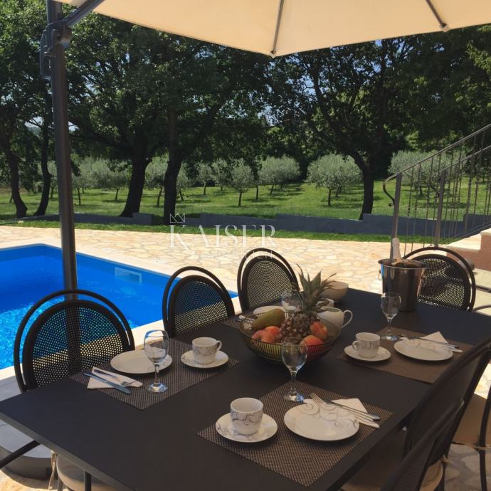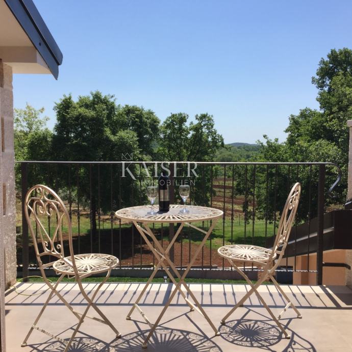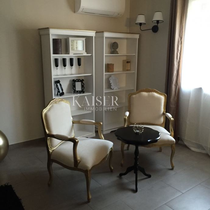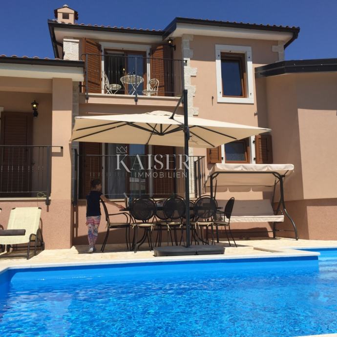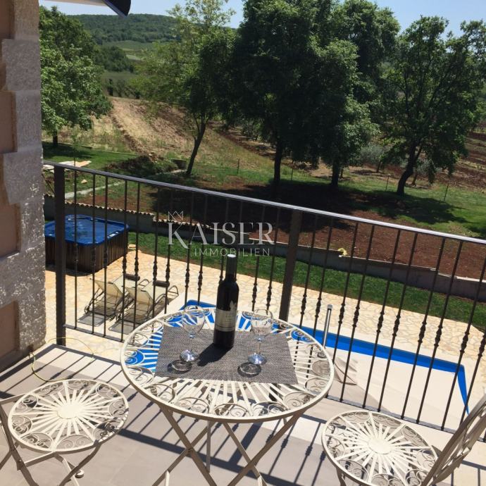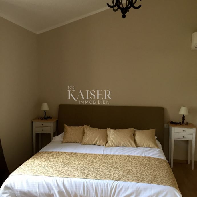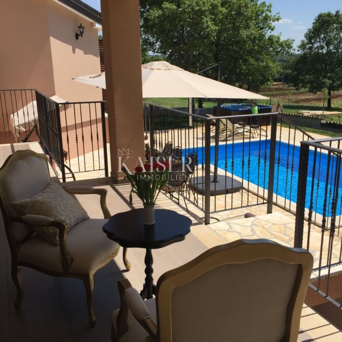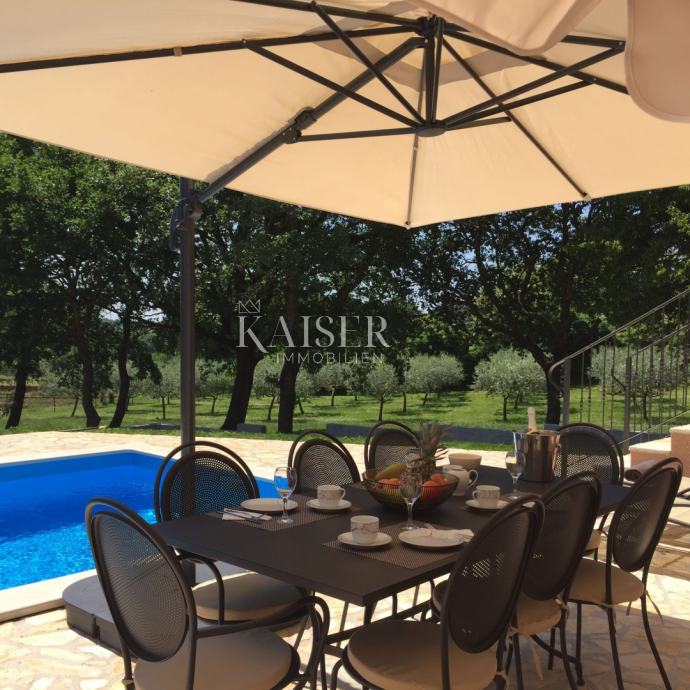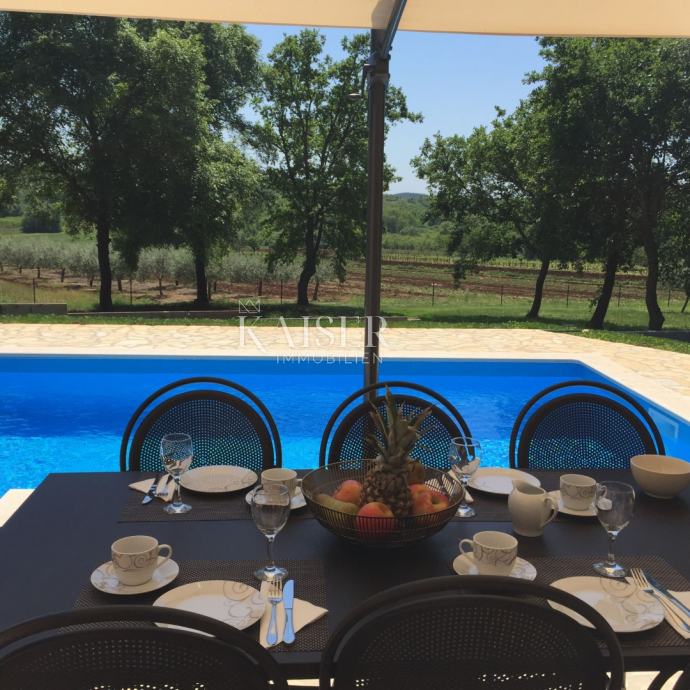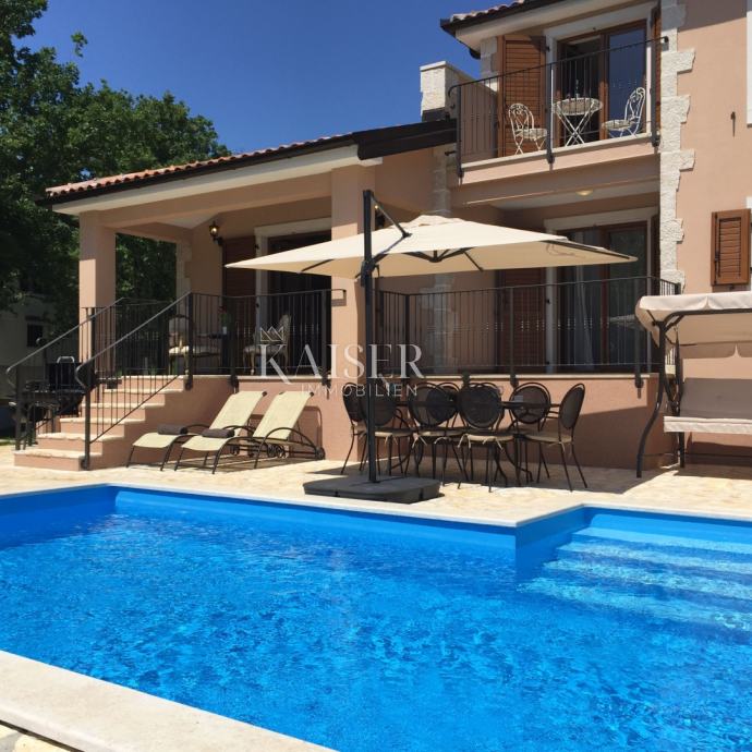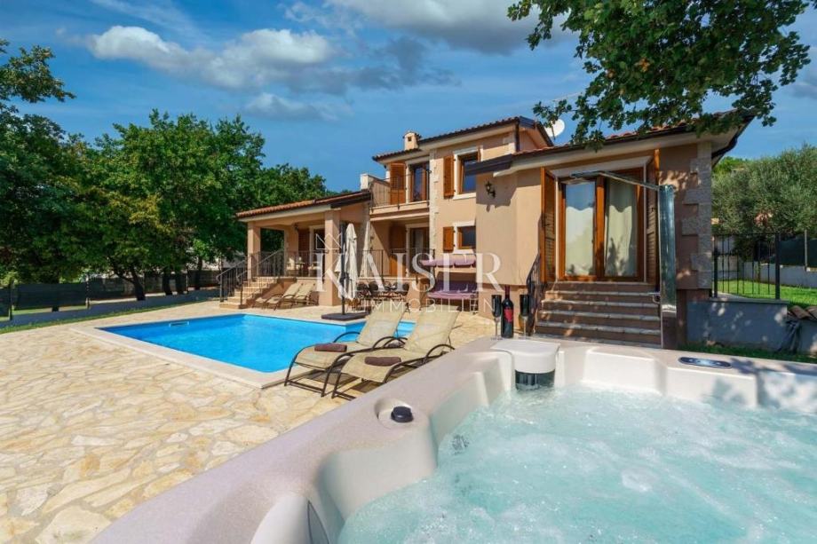 Kaiser Immobilien ponuja v prodajo čudovito rustikalno vilo le 4 km od morja. Vila se nahaja na lastni edinstveni parceli, ločeni od mestne gneče, na majhnem območju nedaleč od mesta Poreč, natančneje le 6 km od centra mesta Poreč. V pritličju vile sta dve spalnici, vsaka s svojo kopalnico, moderno opremljena dnevna soba s kaminom, kuhinja, jedilnica in še en manjši WC. Spodnji del vile omogoča dostop do zunanje pokrite terase in čudovit pogled na bazen in naravo. V prvem nadstropju hiše sta še dve spalnici, ki si delita eno večjo kopalnico. Ena soba se odpira na zunanjo teraso. Na dvorišču vile se nahaja bazen velikosti 24 m2, terasa za sončenje in sprostitev z zunanjim tušem, jacuzzi za 5 oseb, žar in 3 parkirna mesta. Celotno dvorišče okoli vile, torej celoten vrt, je v celoti okrašen z botaniko, značilno za ta del Istre, s čudovito zelenico in čudovitimi rastlinami. Kraj je majhen, avtohton in ponuja oazo miru in uživanja ter pobeg od vsakdanjega vrveža. Če želite, da ta čudovita popolnoma opremljena vila postane vaš novi dom, kontaktirajte agencijo Kaiser Immobilien.
