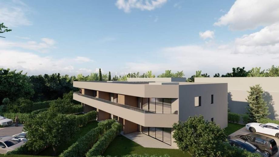 Kaiser Immobilien predstavlja popolnoma novo moderno stanovanje na zelo mirni in atraktivni lokaciji le osem kilometrov od mesta Poreč. Apartma se nahaja le dva kilometra od morja, na robu vasi na eni strani in nedotaknjene narave na drugi strani. V bližini stanovanja so vsi potrebni objekti za življenje, kot so šola, vrtec, trgovina, restavracija in picerija, lekarna, pošta in ambulanta. Ravno zaradi svoje lokacije in vsebine je ta nepremičnina idealna naložba za bivanje ali najem v času turistične sezone. Stanovanje se nahaja v prvem nadstropju stavbe, ki je sestavljena iz pritličja in nadstropja, nanj pa se veže še en podoben objekt s stanovanji za prodajo. Gre za prodajo dvo- in trisobnih stanovanj v velikosti od 75 m2 do 80 m2, zelo moderno zasnovanih z velikimi steklenimi stenami, ki zagotavljajo maksimalno osvetlitev prostora. Stanovanja so grajena z visokokakovostnimi materiali in bodo opremljena z vrhunsko opremo kot so toplotna izolacija objekta (10cm), strešna izolacija (20cm), kvalitetno alu in pvc pohištvo, vrhunska keramika (stranka izbira keramika ali laminat do 35 eur/m2, protivlomna in protipožarna vhodna vrata, opremljena kopalnica s sanitarijami (do 2000 eur), vsakemu stanovanju pa pripadata dve parkirni mesti.Vsa stanovanja imajo teraso s čudovitim pogledom na narava in borov gozd To stanovanje obsega: dve spalnici, kopalnico, kuhinjo in dnevno sobo, hodnik, shrambo in pokrito teraso ter shrambo na terasi in ima 77,82 m2 neto površine. ima dve parkirni mesti.Začetek gradnje je predviden 1. mesec 2024, predviden zaključek pa 12. mesec 2024. Če želite, da bo to novo moderno stanovanje postalo vaš novi dom, pravočasno rezervirajte svoje stanovanje in kontaktirajte agencijo Kaiser Immobilien Poreč.Kupec je oproščen plačila davka na nepremičnine.