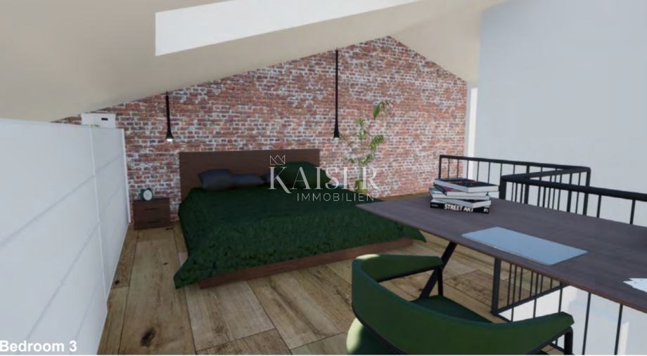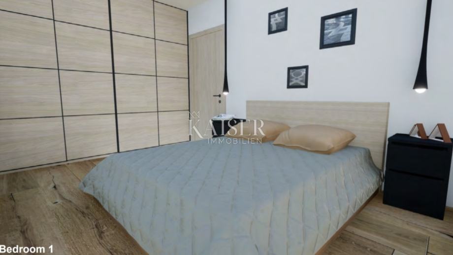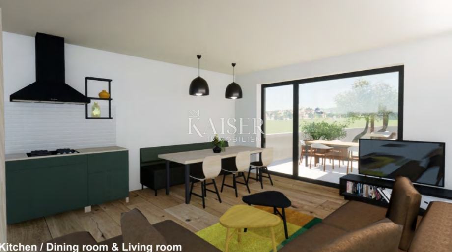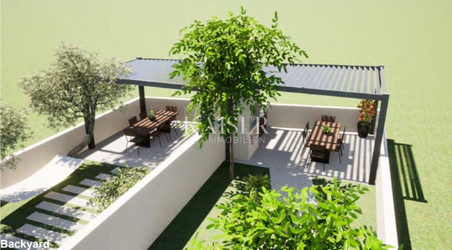 Kaiser Immobilien prodaja moderno vrstno hišo z dvema stanovanjskima enotama. Vsaka stanovanjska enota je sestavljena iz pritličja, nadstropja in mansarde, skupaj 126 m2. V pritličju je predsoba, dve shrambi, kuhinja, jedilnica, dnevna soba in kopalnica. Skozi veliko stekleno steno se dostopa na čudovito teraso velikosti 16 m2 s pergolo v skupni izmeri 17,60 m, na vrtu pa je tudi letna kuhinja. V prvem nadstropju sta dve spalnici s kopalnico. Mansarda je velika 41,90 m2 in je sestavljena iz stopnišča, sobe s kopalnico in terase 11,20 m2. Začetek gradnje, predviden zaključek konec leta 2024.