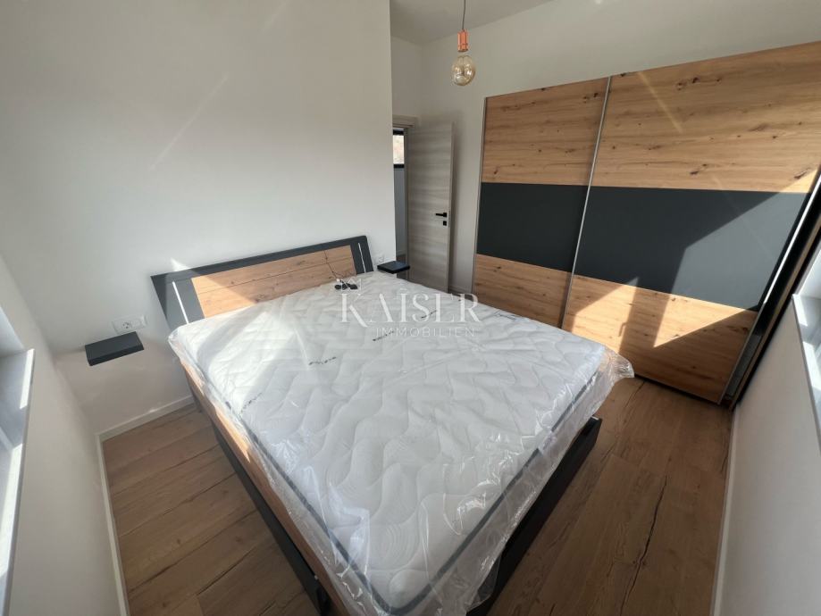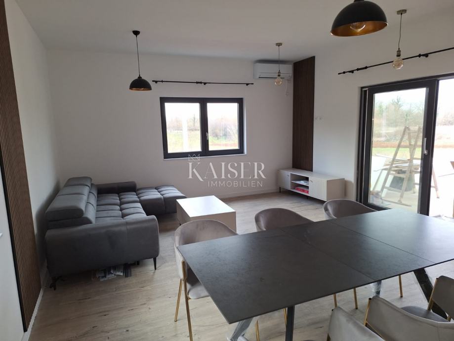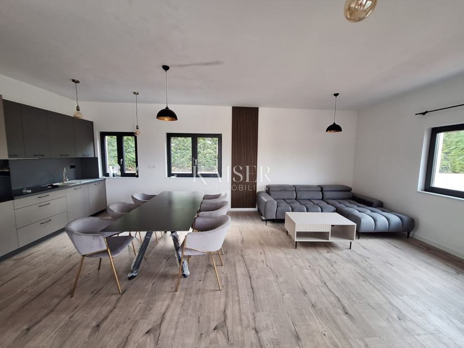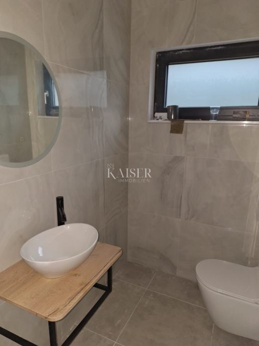 Kaiser Immobilien prodaja čudovito moderno enonadstropno hišo z bazenom. Hiša se nahaja v majhni istrski vasici. Svetvinčenat je oddaljen le nekaj minut vožnje. Morje je oddaljeno 13 km. V bližini hiše se nahajajo restavracije, kmečki turizmi, trgovine, kavarne, šola, vrtec, banka, pošta, avtocesta, promenada, kolesarske steze in razni drugi objekti. Renesančno mesto Svetvinčenat je eden izmed draguljev Istre z bogato turistično ponudbo in številnimi dogodki, ki se odvijajo v izredno privlačnih zgodovinskih prostorih tega mesta. Svetvinčenat krasi renesančni trg "Placa" z gradom Morosini-Grimani, simbolom samega mesta in eno najpomembnejših trdnjav beneške vojske tistega časa v Istri. Pomemben del kulturne dediščine Svetvinčenta so ohranjeni in izjemno dragoceni ostanki stenskih fresk, ki se nahajajo v cerkvi sv. Vincencija pri mestnem pokopališču in v cerkvi sv. Katarine. Posebno mesto z bogato tradicijo, zanimivimi in raznolikimi programi, med katerimi izstopajo Srednjeveški festival, Praznik sira ter Festival plesa in neverbalnega gledališča, vsako leto privabi številne obiskovalce. Ta čudovita novozgrajena enonadstropna hiša se nahaja na parceli 550 m2. Dvorišče je ograjeno in urejeno, znotraj dvorišča pa je več oljk in prostora za več parkirnih mest. Neto stanovanjska površina hiše je 90,20 m2, s terasami pa 106,70 m2 neto. Hiša je sestavljena iz dnevne sobe z odprto kuhinjo in jedilnico, 2 spalnici, kopalnice, stranišča, hodnika in pralnice. Dnevna soba se odpira na prostorno teraso, idealno za uživanje na prostem. S terase lahko pridete do bazena s prostorom za sončenje. Terasa in bazen nudita odprt pogled na naravo. Površina bazena je 28 m2. Hiša se ogreva s klimo, hiša ima tudi dimnik, tako da obstaja možnost vgradnje peči na drva ali pelete. Pri gradnji so bili uporabljeni kvalitetni materiali in stavbno pohištvo, zunanje PVC stavbno pohištvo, 10 cm izolacija, ravna, neprehodna armiranobetonska streha in dodatno izolirana streha. Hiša se prodaja v celoti opremljena. Bazen se prodaja z izdelano prvo fazo (betoniran, izoliran, montaža prve faze), za doplačilo je možna dokončanje bazena v celoti. Glede na to, da gre za novozgrajeno enonadstropno hišo z bazenom in odlično prometno povezanostjo, je ta hiša idealna za mirno družinsko življenje, lahko pa se uporablja tudi kot počitniška hiša in turistični najem. Za več informacij kontaktirajte agenta. Dean Cvitko dean.cvitko@kaiser-immobilien.hr +385 91 5284449